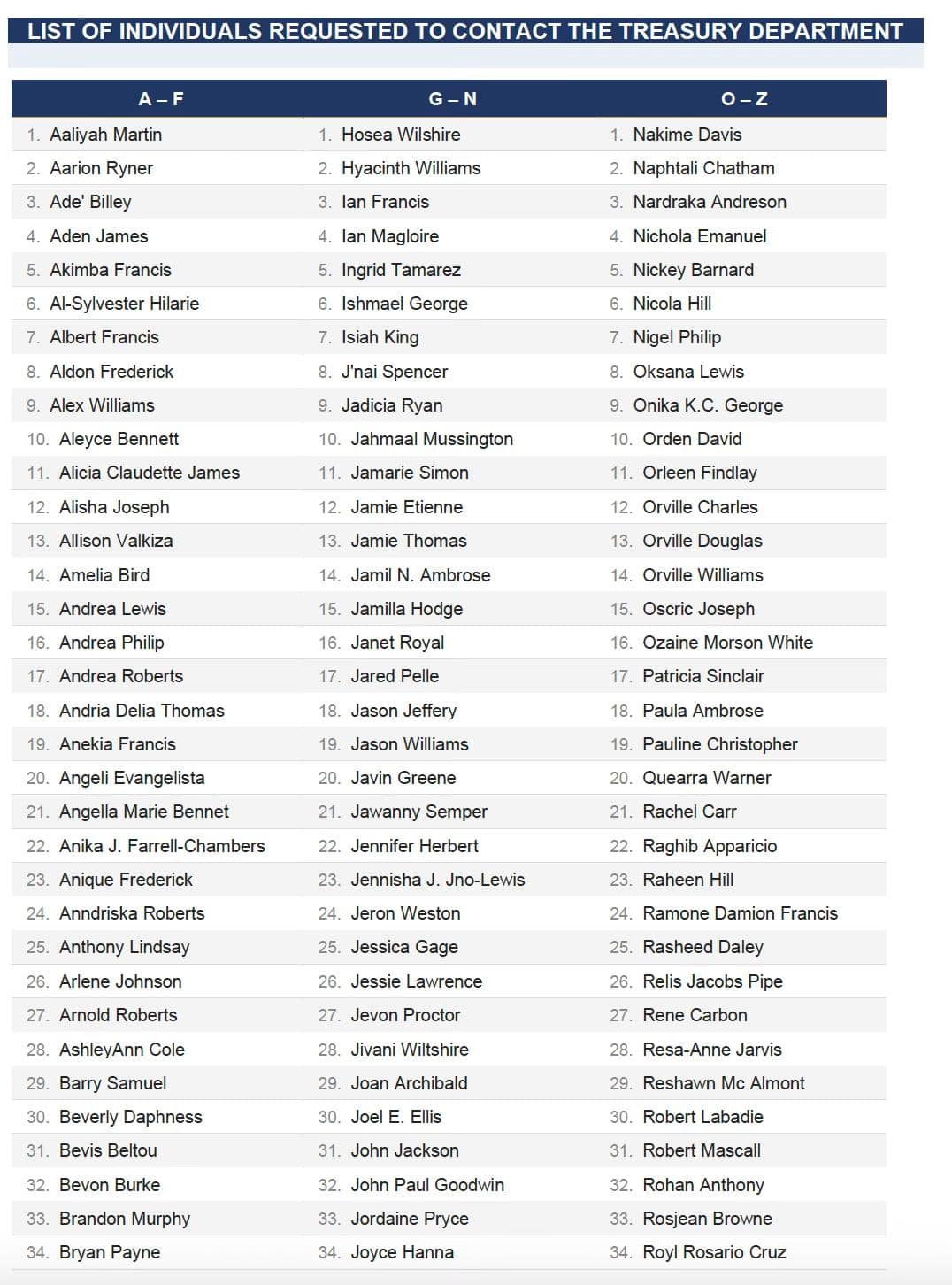 Treasury Names Former Government Employees, Calls on Them to Make Contact Over Outstanding...