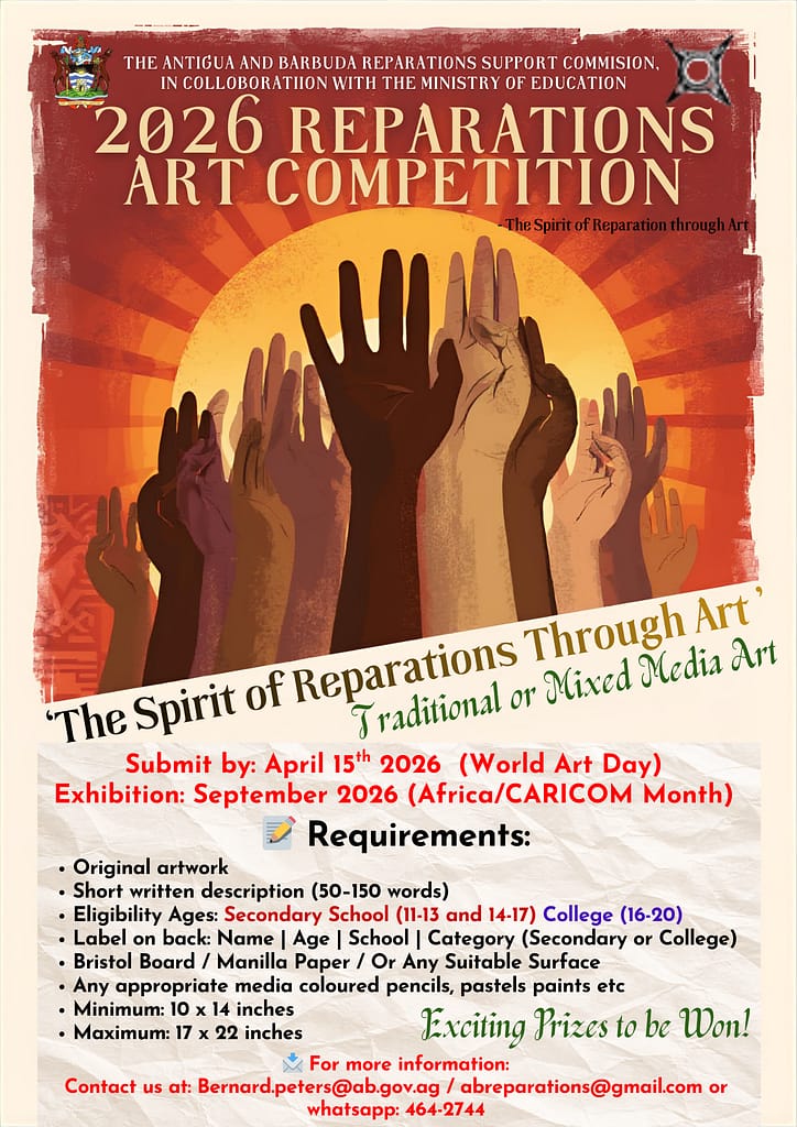 The Antigua and Barbuda Reparations Support Commission (ABRSC), in collaboration with the Ministry of Education, has officially launched the 2026 Reparations Art Competition, inviting secondary school and college students to creatively explore the theme “The Spirit of Reparations through Art.”