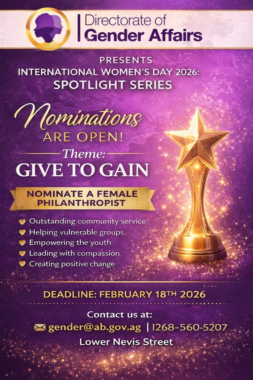 Nominations can be submitted online via a designated form, while additional information is available through the Directorate of Gender Affairs by email at [email protected] or by telephone at 268-560-5207. The Directorate is located on Lower Nevis Street.