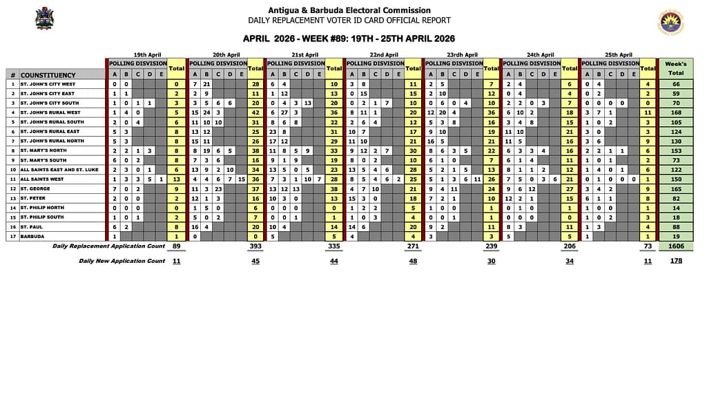 Despite the slowdown, officials noted consistent engagement across most constituencies. St John’s Rural West recorded the highest weekly total with 168 applications, followed by St George with 165 and St Mary’s North with 153.