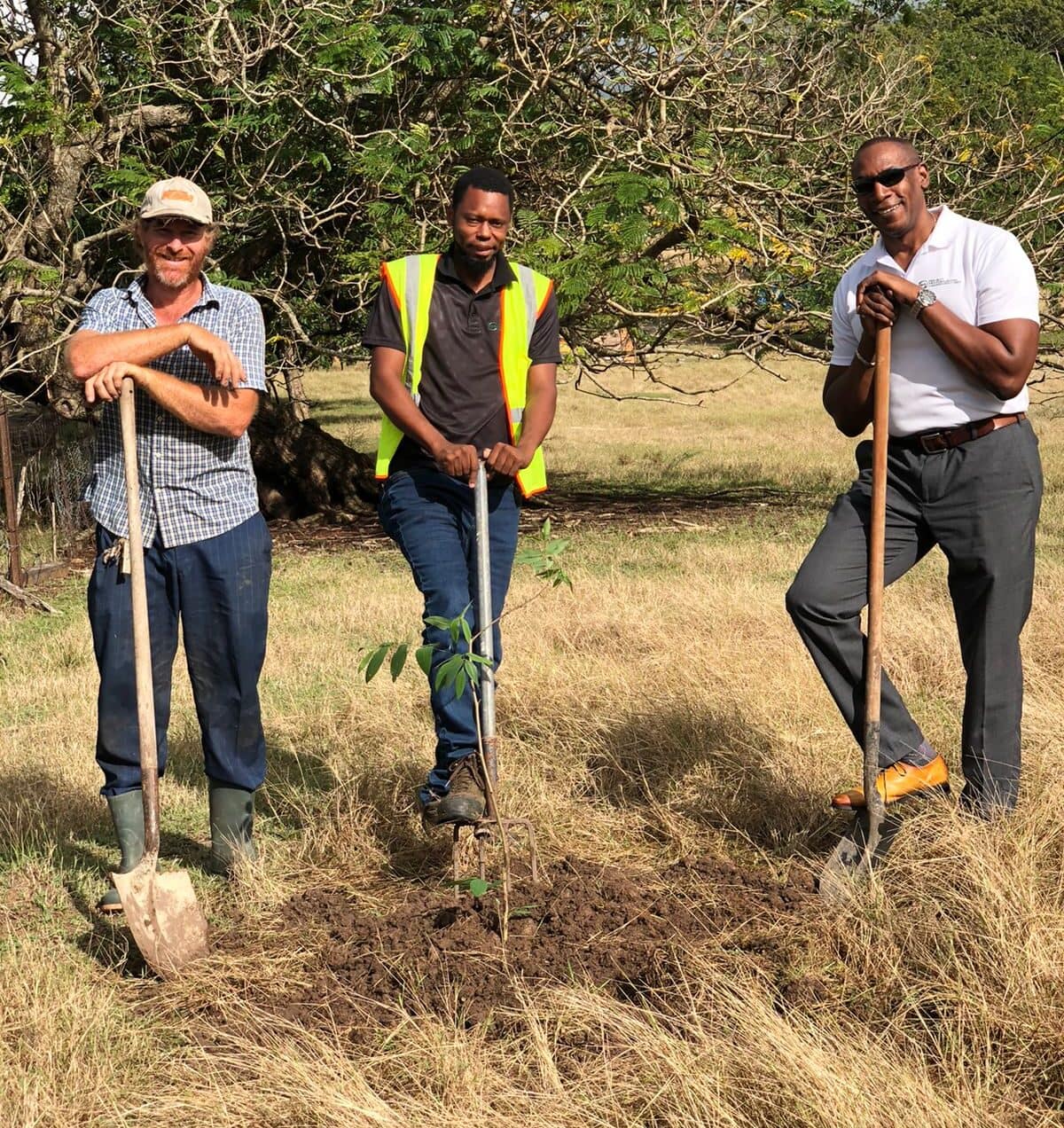 The planting was conducted by Mr. Adrian Hall, Manager at Hall Estate; Mr. Trevor Thomas, Driver at PIMU; Mr. Sherwin Harding, Deputy Community Liaison Officer at PIMU; and Mr. Winston Whyte, Project Coordinator at PIMU.