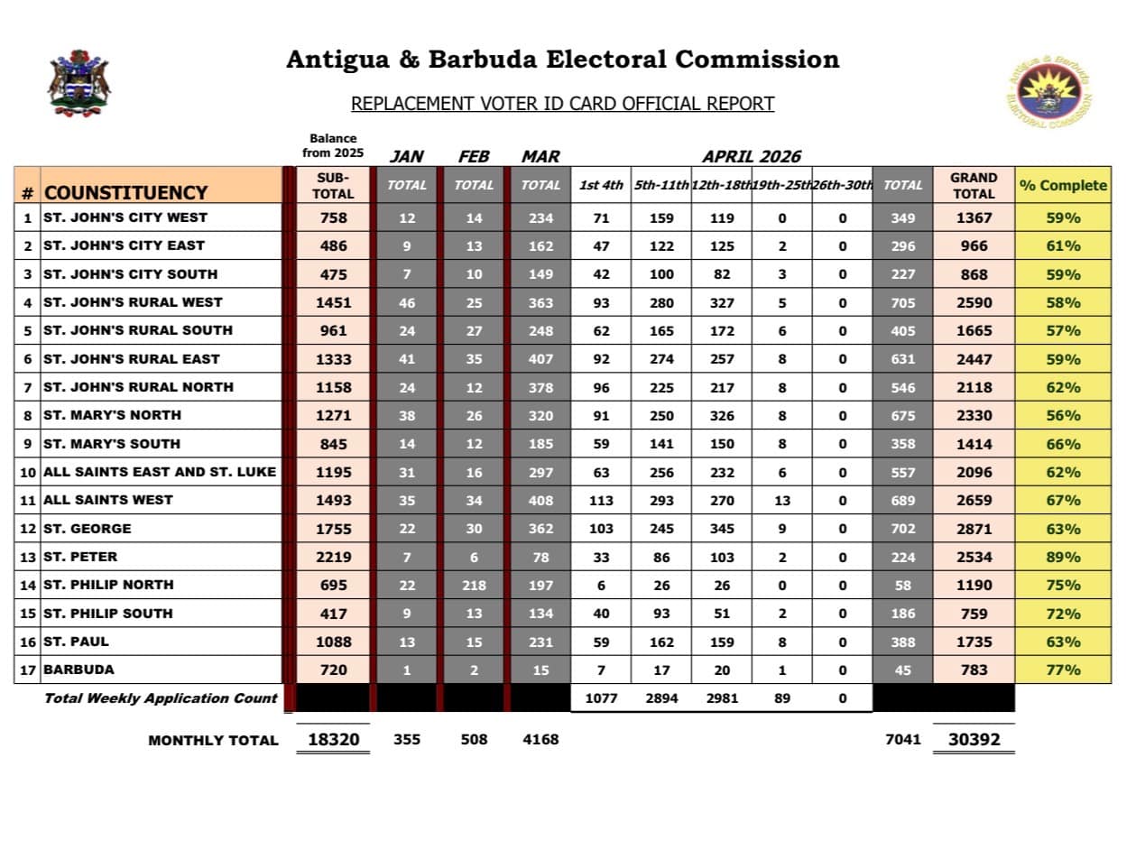 ST. JOHN’S, Antigua — More than 30,000 voter ID cards have been replaced ahead of the April 30 general election, according to the latest report from the Antigua and Barbuda Electoral Commission (ABEC), with several constituencies nearing full compliance.